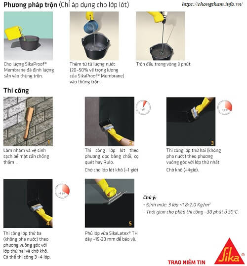 Sử dụng 20 -50% nước vào Sikaproof Membrane sau đó khuấy đều. Sử dụng cọn, ru bô, bình phun thi công lớp sơn lót lên toàn bộ bề mặt khu vực cần chống thấm.